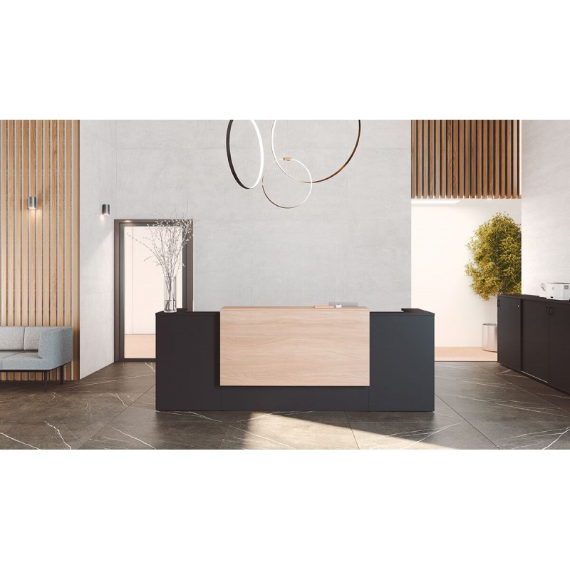 Mostrador de oficina Ofimat Plus. Fabricado por Actiu en melamina de 25mm y canteado en pvc de 2mm para sobres, laterales mostrador y repisa decorativa. Frontal y laterales decorativos fabricados en melamina de 19mm y canteado en 2mm. El fabricante aconseja el uso de los Embellecedores laterales del mostrador siempre que el mostrador tenga vista de paso. Recuerde que el transporte no está incluido en el precio. Las imágenes son orientativas, lea detenidamente la descripción del producto y configúrelo con las distintas opciones disponibles. Para más información llámenos. Se sirve desmontado. Fácil montaje.
